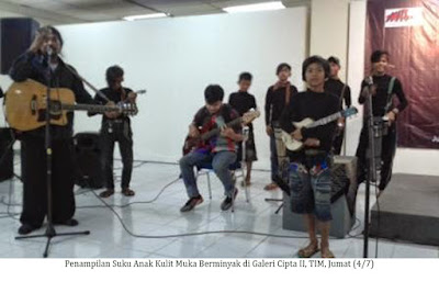 Seusai diskusi terbuka pada Jumat (4/7) sore lalu, pembawa acara memanggil Suku Anak Kulit Muka Berminyak untuk tampil sebagai penghibur. Suku Anak Kulit Muka Berminyak adalah sebuah kelompok musik bentukkan komunitas Sastra Kalimalang yang anggotanya terdiri dari pengamen jalanan. Satu per satu anggota Suku Anak Kulit Muka Berminyak memasuki ruang Galeri Cipta II, Taman Ismail Marzuki. Sambil membawa alat musik, mereka berjalan menuju posisi masing-masing.