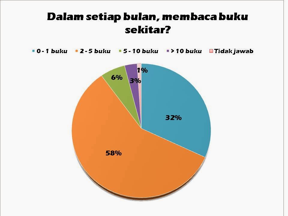 Dari survei tersebut juga diketahui bahwa 32% mahasiswa membaca lebih dari 10 buku setiap bulan. Dan 58% mahasiswa membaca buku sekitar 2-5 setiap bulan, hal tersebut dikarenakan mahasiswa membutuhkan waktu sekitar 1 minggu untuk menyelesaikan satu buku, sebanyak 43% mahasiswa mengatakan demikian.