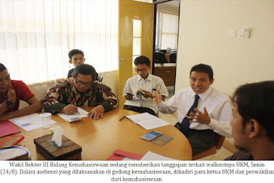 Terkait walk out UKM dari pelaksanaan Opak tahun 2015, Warek Bidang Kemahasiswaan, Yusron Razak menghargai langkah yang diambil Forum UKM. “Saya mengapresiasi langkah UKM terkait pengunduran diri dan minta maaf apabila ada kesalahan dalam sistem ini,” ujarnya dalam audiensi bersama perwakilan UKM di lantai 2 gedung Kemahasiswaan, Senin (24/8).