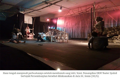Itulah cuplikan dari pertunjukkan drama bertajuk Persembunyian yang diadakan oleh Unit Kegiatan Mahasiswa (UKM) Teater Syahid, Senin (30/5). Acara tersebut merupakan ajang untuk anggota muda Teater Syahid dalam masa pendidikan. Persembunyian dilaksanakan selama dua hari, yakni 30-31 Mei 2016 di Aula Student Center (SC).