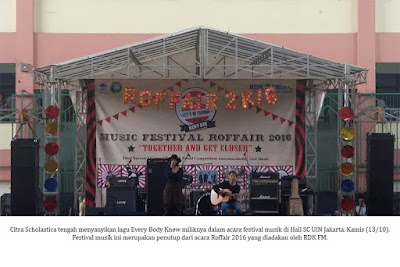 Ratusan penonton yang memadati Hall Student Center (SC) Universitas Islam Negeri (UIN) Syarif Hidayatullah Jakarta tengah menanti penampilan dari bintang tamu dalam acara festival musik. Festival musik yang bertemakan Together and Get Closer, merupakan penutup dari rangkaian acara tahunan RDK Off Air (Roffair) 2016 yang diadakan oleh Lembaga Otonom (LO) Radio Dakwah Komunikasi Frequency Modulation (RDK FM), Kamis (13/10).