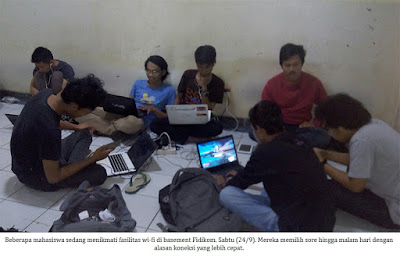 Tak hanya Kanzul, berburu wi-fi juga dilakukan Fairuz Nisrina. Mahasiswi Fakultas Ekonomi dan Bisnis (FEB) ini biasanya menggunakan layanan hotspot yang dapat terakses cepat, seperti di besment FEB dan Fidikom.