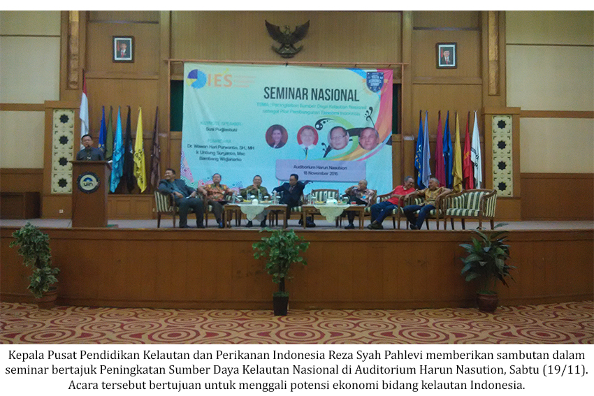 Demikian yang disampaikan oleh Kepala Pusat Pendidikan Kelautan dan Perikanan Indonesia Reza Syah Pahlevi dalam seminar bertajuk Peningkatan Sumber Daya Kelautan Nasional di Auditorium Harun Nasution, Sabtu (19/11). Seminar tersebut merupakan rangkaian acara Youth Economics Summit yang diselenggarakan oleh Fakultas Ekonomi dan Bisnis (FEB) Universitas Islam Negeri (UIN) Syarif Hidayatullah Jakarta.