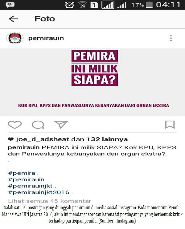 Momentum Pemilihan Umum (Pemilu) Mahasiswa kembali hadir di Universitas Islam Negeri (UIN) Syarif Hidayatullah Jakarta. Dalam perayaan pemilu ini, muncul akun anonim bernama pemirauin di media sosial Instagram. Dalam pantauan Institut hingga 21 Desember 2016, akun ini telah memiliki 1280 followers dan 6.417 following.