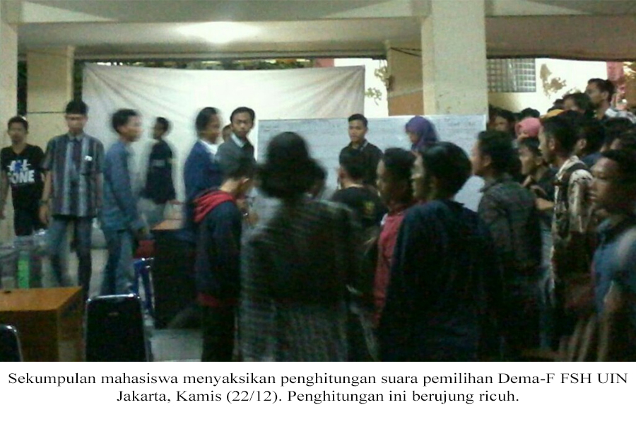 Penghitungan suara pemilihan raya Fakultas Syariah dan Hukum Universitas Islam Negeri (UIN) Syarif Hidayatullah Jakarta, Kamis (22/12) diwarnai kericuhan. Aksi saling pukul pun tak terhindarkan.