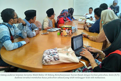 Ditemui dalam Sidang Audiensi, Perwakilan Solidaritas Mahasiswa Mahasiswi 2017 Nadzirotus Sarwa mempertanyakan ketegasan pihak universitas terkait mekanisme penyelesaian kasus pelecehan seksual. Pasalnya, sebagai seorang mahasiswa baru (maba) dirinya merasa disepelekan. “Maba seharusnya tidak mendapatkan pelecehan seksual dari kakak tingkat,” cetusnya di Gedung Kemahasiswaan lantai dua, Senin (4/9).