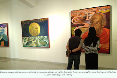 Tiga puluh tiga lukisan yang memuat berbagai filosofi tentang kesaksian budaya Indonesia menyambut pengunjung di Gedung D Pameran Galeri Nasional, Jakarta, Senin (18/9). Lukisan tersebut hasil buah tangan Yos Suprapto. Sebagai pelaku budaya, Yos ingin berdialog melalui karya-karyanya yang lahir dari cita karsa sebagai masyarakat Indonesia.