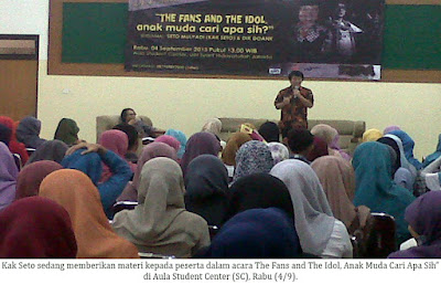 Hal di atas disampaikan Dik Doank kepada peserta yang hadir dalam acara “The Fans and The Idol, Anak Muda Cari Apa Sih?” di Aula Student Center (SC), Rabu (4/9). Selain mencintai sebuah proses, Dik Doank juga mengajari bagaimana seharusnya kita mengidolakan seorang idola. Sebelum mencontoh orang yang diidolakan, ia menyarankan untuk terlebih dahulu mengenali diri sendiri.
