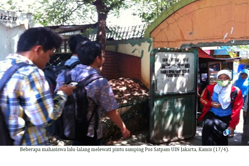 Pada 11 Februari lalu, Kepala Biro Administrasi Umum dan Kepegawaian (AUK) Universitas Islam Negeri (UIN) Jakarta, Reti Indarsih, menginstruksikan kepada Satpam UIN Jakarta untuk menutup pintu samping pos Satpam pada hari Sabtu, Minggu, dan hari Libur Nasional serta pukul 19.00 untuk Senin s.d. Jumat. Alasannya, penutupan itu diberlakukan demi menjaga keamanan kampus.