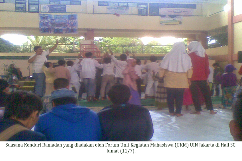 Jumat lalu, (11/7), Forum Unit Kegiatan Mahasiswa (UKM) Universitas Islam Negeri (UIN) Syarif Hidayatullah Jakarta mengadakan Kenduri Ramadan. Acara ini berupa buka puasa bersama dengan sekitar 50 anak jalanan dari Taman Pendidikan Anak (TPA) Pelangi, Kampung Pemulung Pisangan. Selain itu, dalam acara yang bertemakan “Ramadan Ceria” tersebut, forum UKM juga memberikan santunan dalam bentuk uang dan bingkisan.