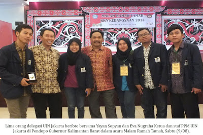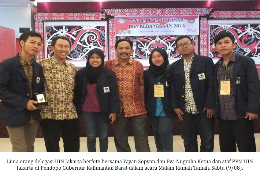 6 Agustus lalu, UIN Jakarta memberangkatkan lima orang mahasiswanya untuk mengikuti program Kuliah Kerja Nyata (KKN) Kebangsaan 2014 di Kalimantan Barat. Mereka adalah Abdul Muslih (Tafsir Hadis), Azizah Nida Ilyas (Jurnalistik), Basit Zainurrohman (Tafsir Hadis), Gita Nawangsari (Jurnalistik), dan Irfan Sanusi (Tafsir Hadis).