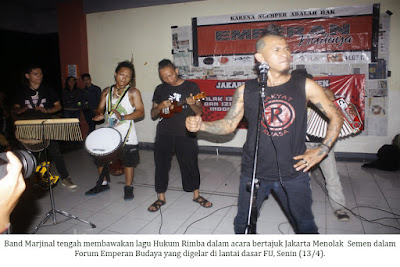 Sementara itu, Gitaris Marjinal, Bobby menuturkan, kemungkinan besar putusan Pengadilan Tata Usaha Negara (PTUN) pada 16 April mendatang akan dimenangkan oleh PT Semen Indonesia. Hal itu dikarenakan kurang dukungan dan tidak banyak warga yang mengetahui isu tersebut. “Meski demikian, dukungan untuk menolak berdirinya pabrik semen di Jawa Tengah harus tetap dilakukan,” ujar Bobby sebelum perform dalam acara Emperan Budaya.