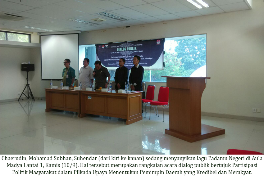 Demikian disampaikan oleh Ketua Komisi Pemilihan Umum Daerah (KPUD) Kota Tangerang Selatan, Mohamad Subhan dalam dialog publik bertajuk Partisipasi Politik Masyarakat dalam Pilkada Upaya Menentukan Pemimpin Daerah yang Kredibel dan Merakyat di Aula Madya lantai 1 Fakultas Ilmu Sosial dan Ilmu Politik (FISIP) Universitas Islam Negeri (UIN) Syarif Hidayatullah Jakarta, Kamis (10/9).
