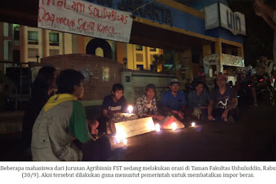 Aksi diawali dengan mahasiswa duduk bersimpuh menggunakan penerangan cahaya lilin kecil, dilanjutkan dengan menyanyikan lagu perjuangan seperti Darah Juang karya John Tobing. Aksitersebut merupakan bentuk dukacita atas tewasnya Salim ‘kancil’ petani asal Lumajang serta Tosan yang masih berbaring sakit karena dipukuli.