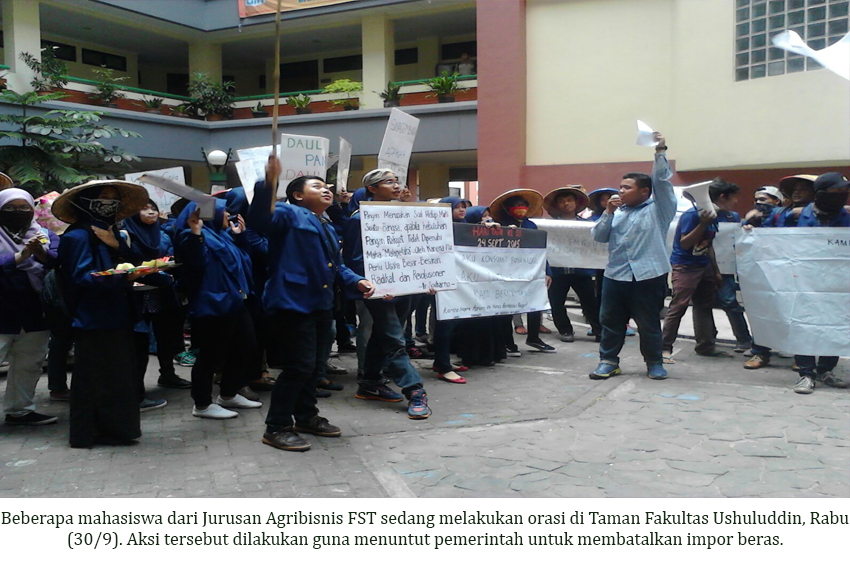 Tiga baris kalimat itulah yang dilaungkan oleh beberapa mahasiswa dari Jurusan Agribisnis Fakultas Sain dan Teknologi (FST) dalam aksi bertajuk “KONTEMPLASI KEDAULATAN PANGAN : Refleksi Memperingati Hari Tani ke-55”. Aksi dimulai dengan berjalan dari halaman FST kemudian ke Fakultas Syariah dan Hukum (FSH) dan berakhir di depan Halte Universitas Islam Negeri (UIN) Syarif Hidayatullah Jakarta, Rabu (30/9).