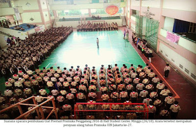 Pemandangan terlihat berbeda di Lapangan Parkir Student Center (SC) Universitas Islam Negeri (UIN) Syarif Hidayatullah Jakarta. Tak seperti biasanya, lapangan parkir yang selalu dipadati kendaraan bermotor, kini ramai dipenuhi sekumpulan orang. Mengenakan baju coklat dengan kacu merah putih yang menempel di leher, terdengar sorak-sorai beradu yel-yel tepuk Pramuka dari peserta.