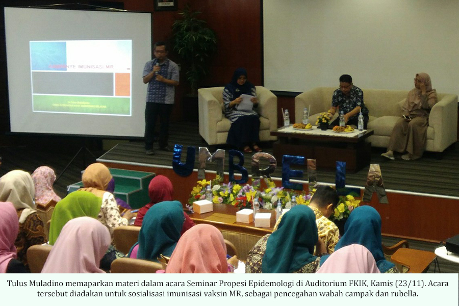 Dalam rangka pencegahan wabah campak dan rubella, Peminatan Epidemologi Kesehatan Masyarakat (Kesmas) Fakultas Kedoteran dan Ilmu Kesehatan (FKIK) Universitas Islam Negeri (UIN) Syarif Hidayatullah Jakarta mengadakan Seminar Profesi (Semprof) Epidemologi, Kamis (23/11). Semprof Epidemologi tersebut bertajuk UMBRELLA “Urgency of MR Immunization to Beat Rubella and Measles,” diadakan di Auditorium FKIK UIN Jakarta Lantai Dua.
