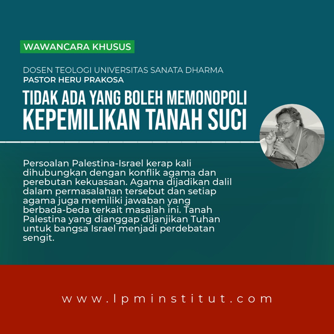 Tanah Palestina yang dianggap dijanjikan Tuhan untuk bangsa Israel menjadi perdebatan sengit. Di Islam sendiri tidak meyakini hal demikian karena dalam sejarahnya orang Yahudi mengingkari perintah Allah untuk memasuki tanah Palestina, sehingga menyebabkan mereka bukan lagi menjadi bangsa yang dipilih Allah terhadap tanah Palestina. Siapa yang paling berhak atas tanah Palestina dan bagaimana sejarah tanah Palestina dalam prespektif agama kristen, pada kesempatan ini Institut melakukan wawancara khusus pada Senin (7/6), dengan Dosen Fakultas Teologi Universitas Sanata Dharma Yogyakarta, Pastor Heru Prakosa.